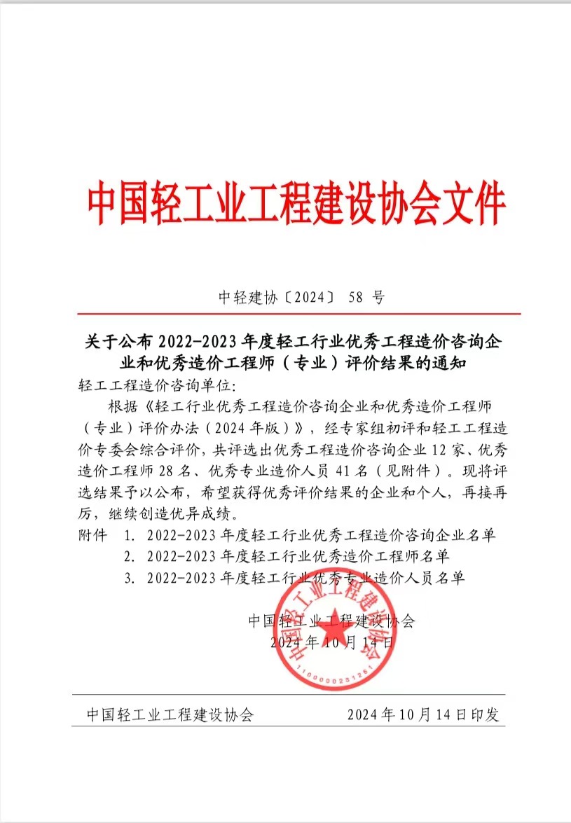 关于公布2022-2023年度轻工行业优秀工程造价咨询企业和优秀造价工程师(专业)评价结果的通知