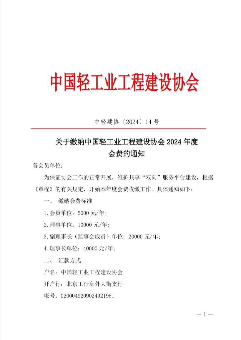 关于缴纳中国轻工业工程建设协会2024年度会费的通知