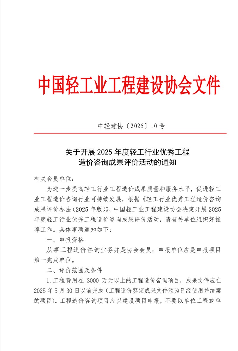 关于开展2025年度轻工行业优秀工程 造价咨询成果评价活动的通知