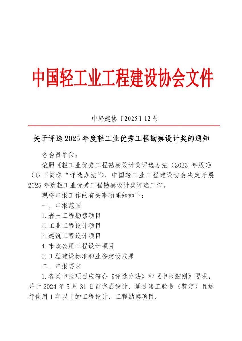 关于评选2025年度轻工业优秀工程勘察设计奖的通知
