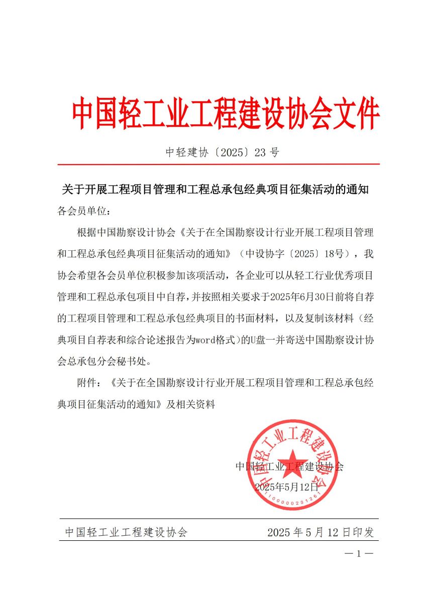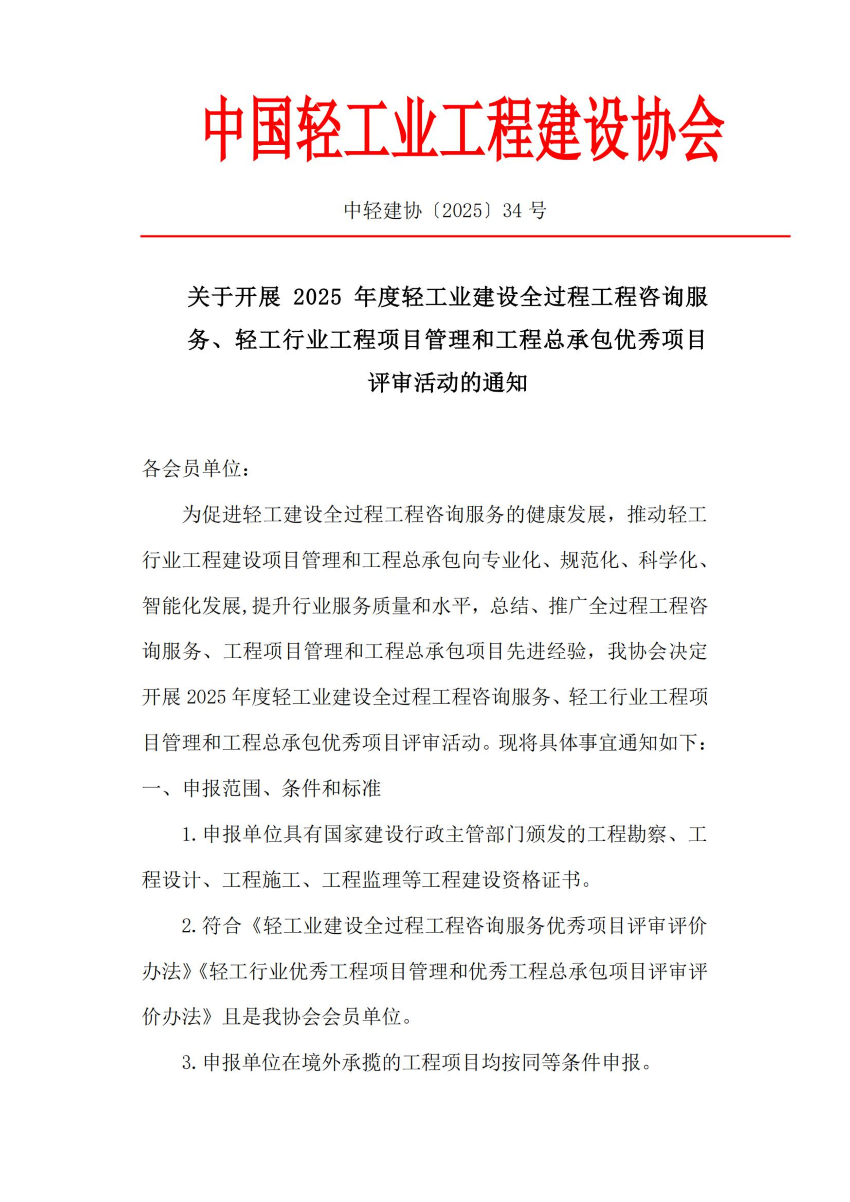 关于开展2025年度轻工业建设全过程工程咨询服务、轻工行业工程项目管理和工程总承包优秀项目 评审活动的通知