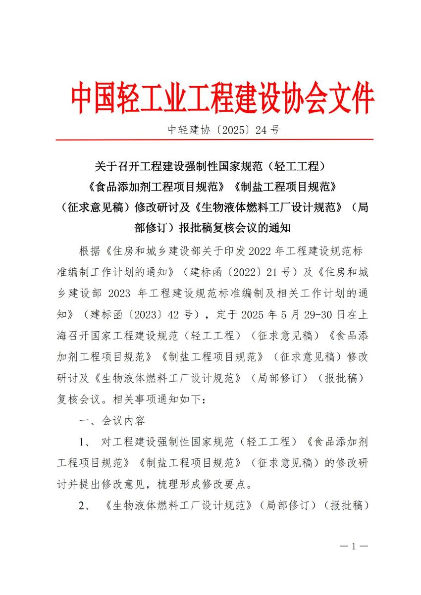 关于召开工程建设强制性国家规范(轻工工程) 《食品添加剂工程项目规范》《制盐工程项目规范》 (征求意见稿)修改研讨及《生物液体燃料工厂设计规范》(局部修订)报批稿复核会议的通知