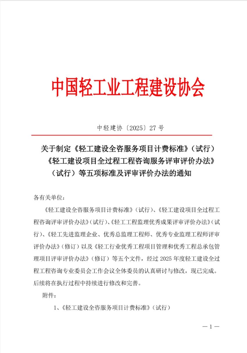 关于制定《轻工建设全咨服务项目计费标准》(试行) 《轻工建设项目全过程工程咨询服务评审评价办法》 (试行)等五项标准及评审评价办法的通知