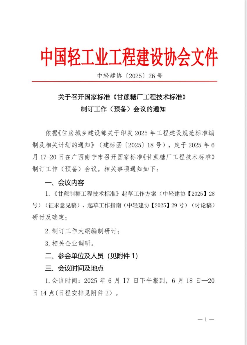 关于召开国家标准《甘蔗糖厂工程技术标准》 制订工作(预备)会议的通知
