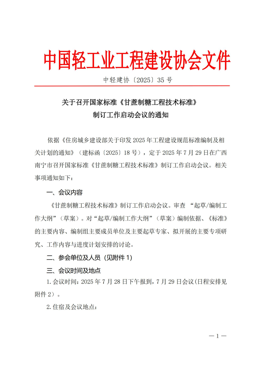 关于召开国家标准《甘蔗制糖工程技术标准》 制订工作启动会议的通知