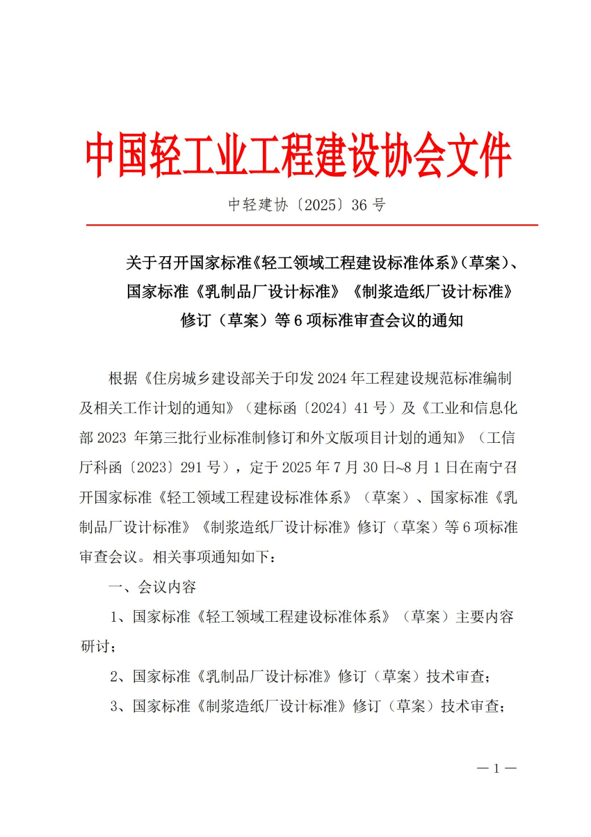 关于召开国家标准《轻工领域工程建设标准体系》(草案)、国家标准《乳制品厂设计标准》《制浆造纸厂设计标准》修订(草案)等6项标准审查会议的通知