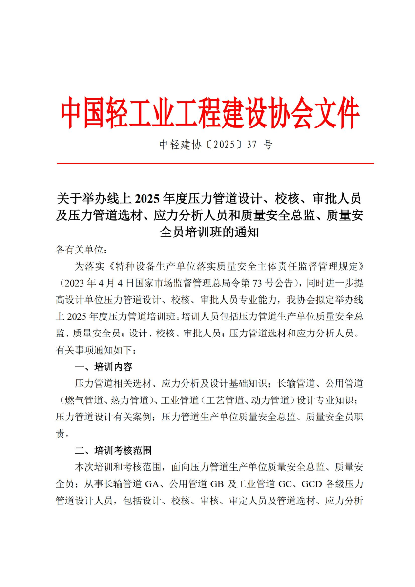 关于举办线上2025年度压力管道设计、校核、审批人员 及压力管道选材、应力分析人员和质量安全总监、质量安全员培训班的通知