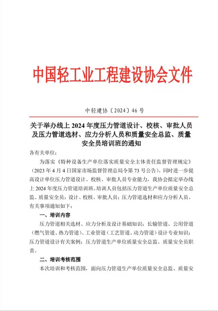 关于举办线上2024年度压力管道设计、校核、审批人员 及压力管道选材、应力分析人员和质量安全总监、质量安全员培训班的通知