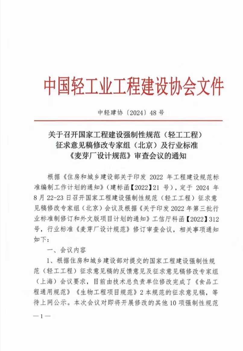 关于召开国家工程建设强制性规范(轻工工程) 征求意见稿修改专家组(北京)及行业标准 《麦芽厂设计规范》审查会议的通知