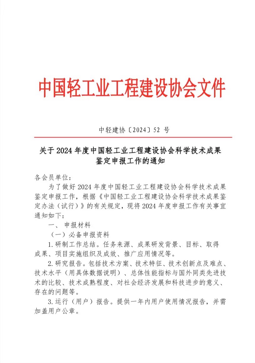 关于 2024年度中国轻工业工程建设协会科学技术成果鉴定申报工作的通知
