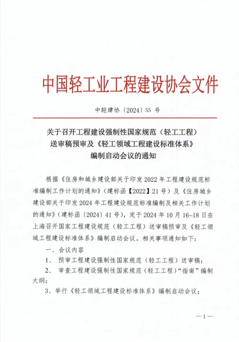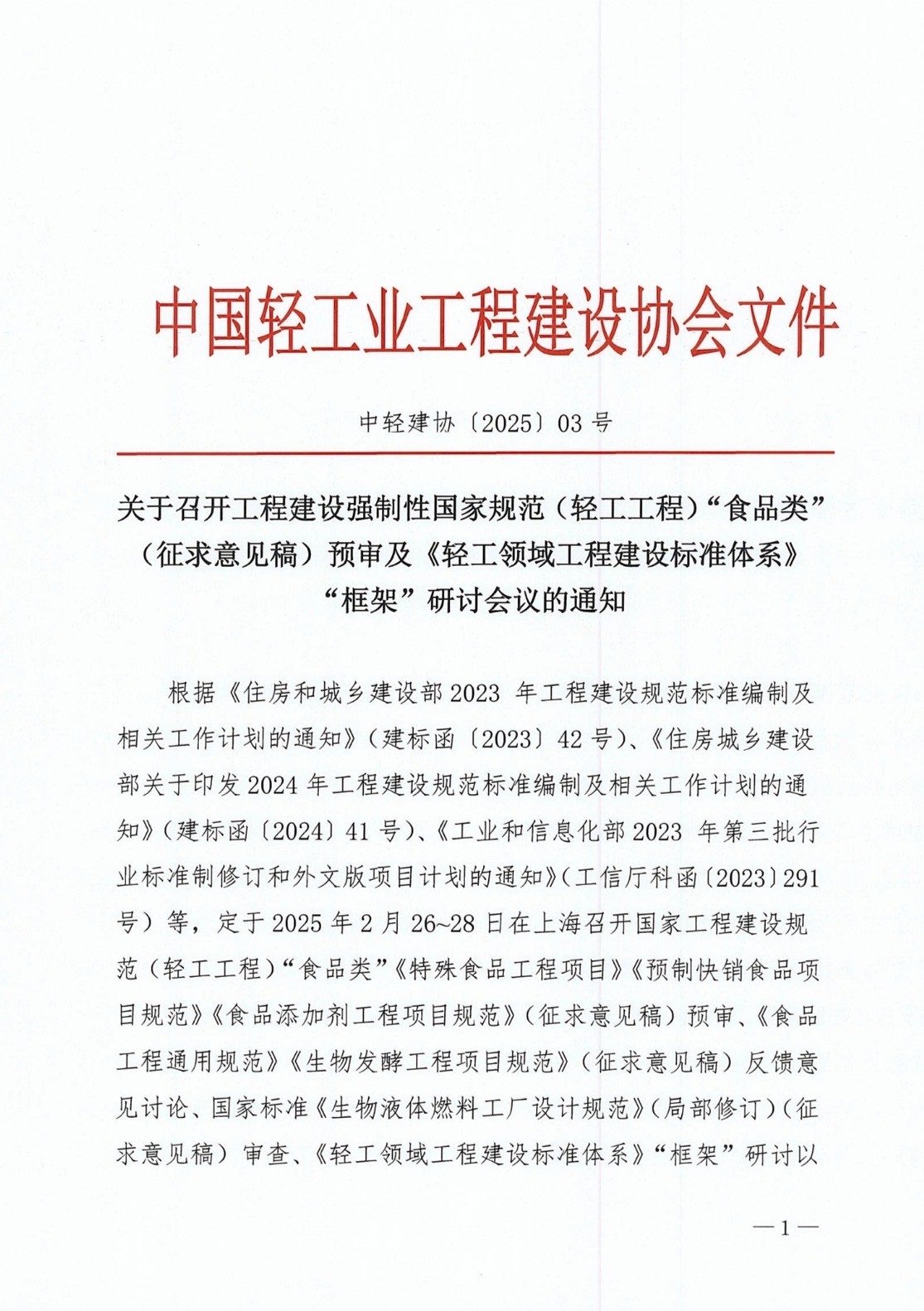 关于召开工程建设强制性国家规范(轻工工程)“食品类”(征求意见稿)预审及《轻工领域工程建设标准体系》 “框架”研讨会议的通知