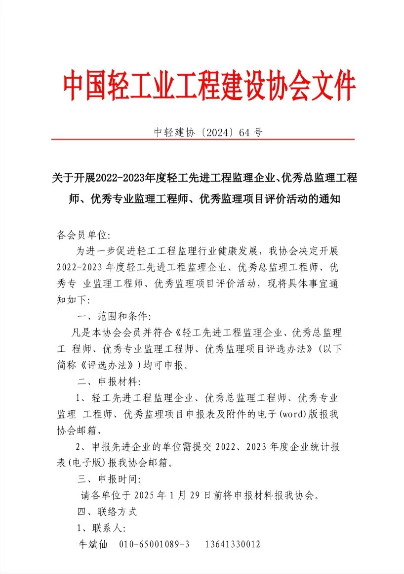 关于开展2022-2023年度轻工先进工程监理企业、优秀总监理工程师、优秀专业监理工程师、优秀监理项目评价活动的通知