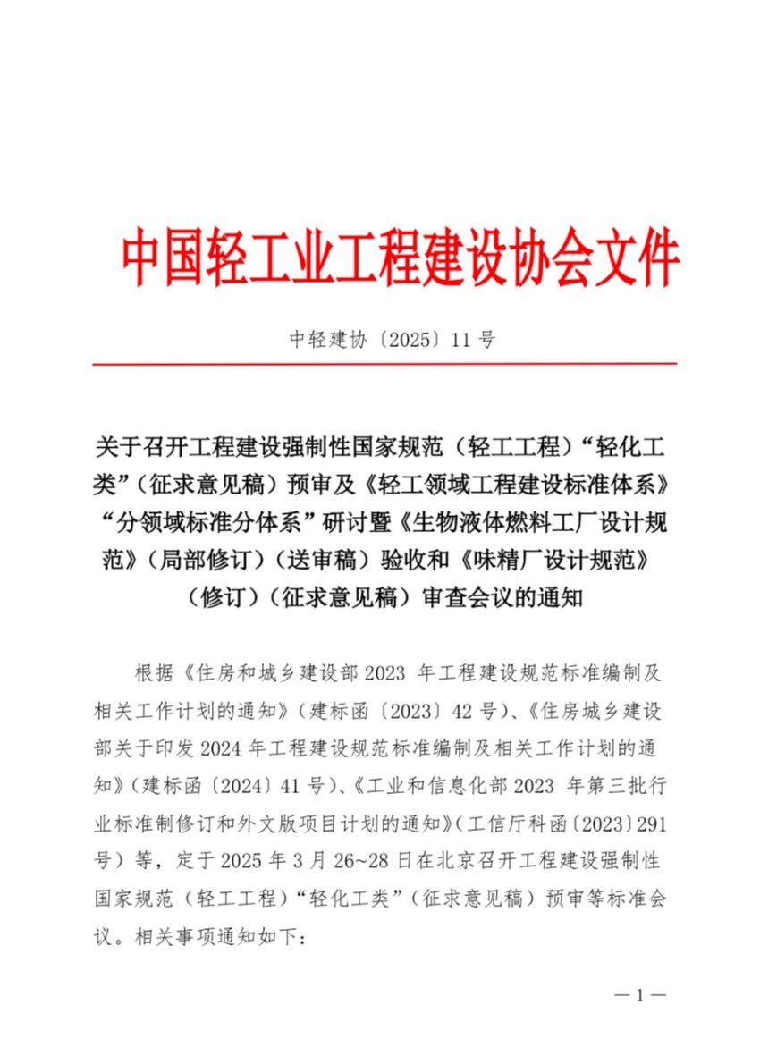 关于召开工程建设强制性国家规范(轻工工程)“轻化工类”(征求意见稿)预审及《轻工领域工程建设标准体系》 “分领域标准分体系”研讨暨《生物液体燃料工厂设计规范》(局部修订)(送审稿)验收和《味精厂设计规范》 (修订)(征求意见稿)审查会议的通知