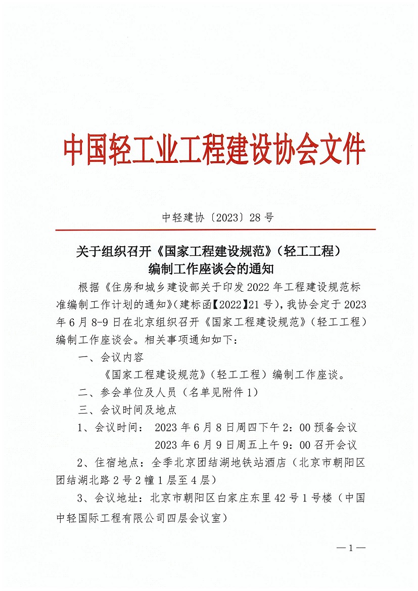 关于组织召开《国家工程建设规范》(轻工工程) 编制工作座谈会的通知