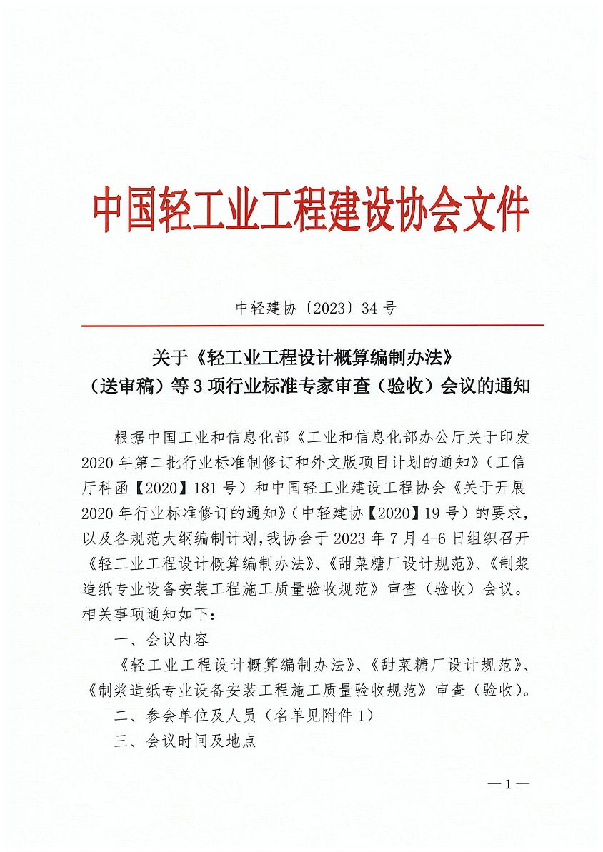 关于《轻工业工程设计概算编制办法》(送审稿)等三项行业标准专家审查(验收)会议的通知)