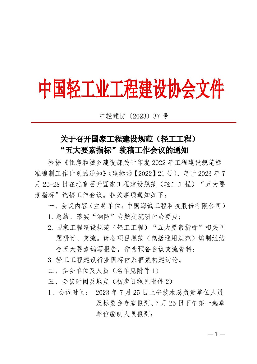 关于召开国家工程建设规范(轻工工程) “五大要素指标”统稿工作会议的通知