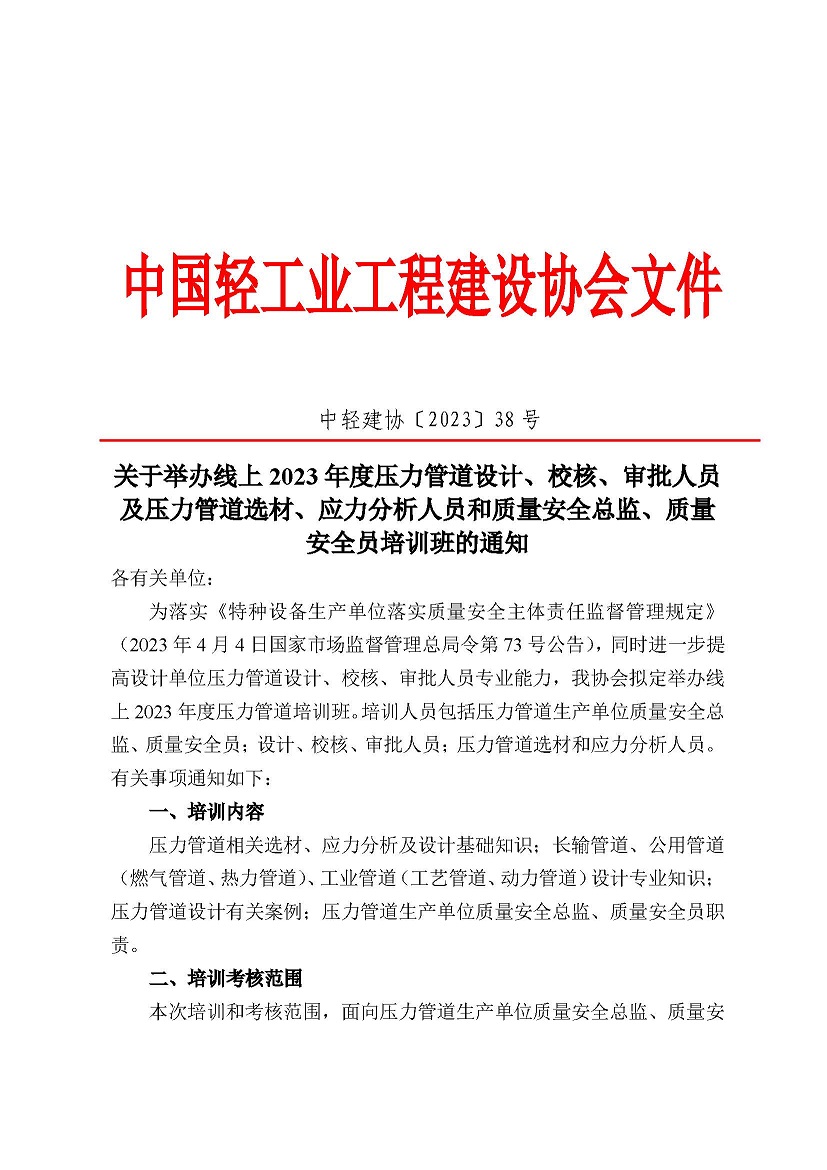 关于举办线上2023年度压力管道设计、校核、审批人员 及压力管道选材、应力分析人员和质量安全总监、质量安全员培训班的通知
