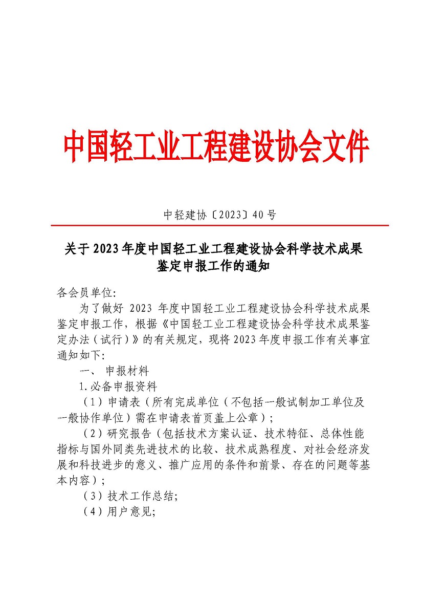 关于2023年度中国轻工业工程建设协会科学技术成果 鉴定申报工作的通知