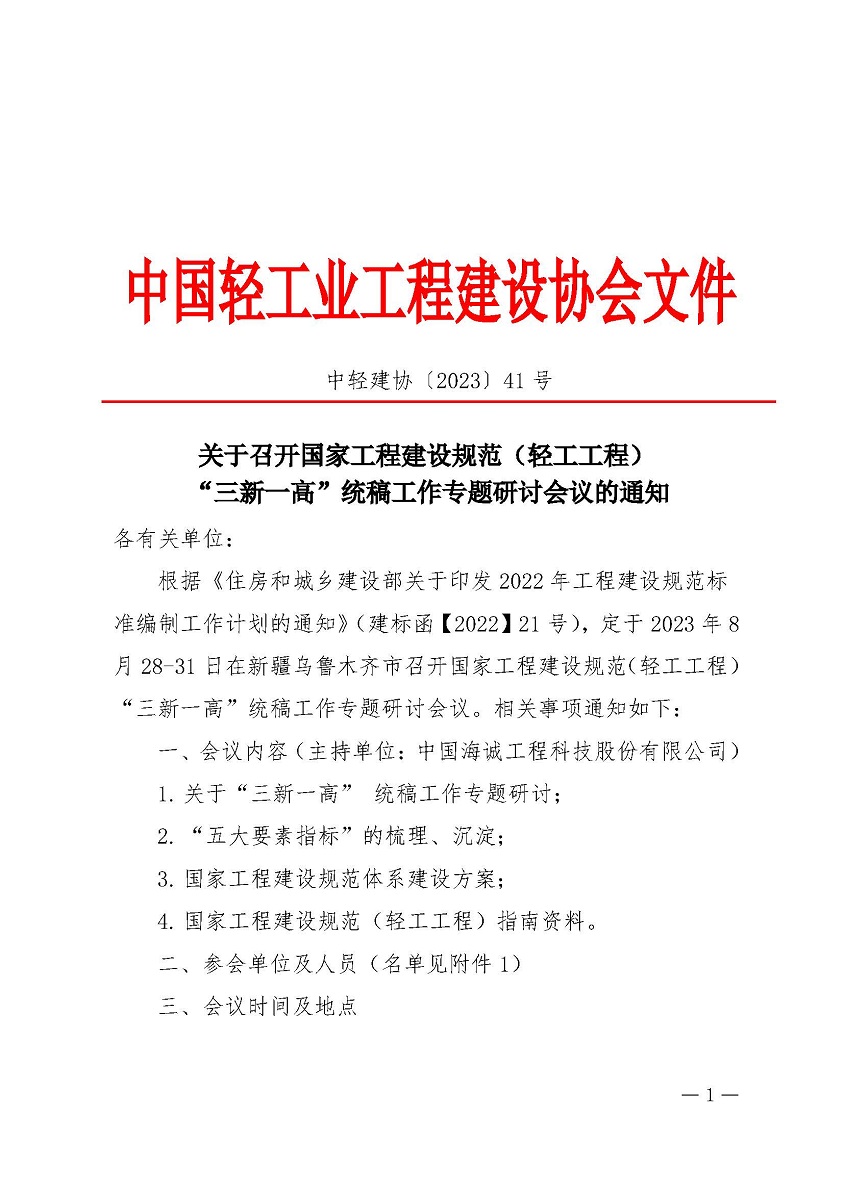 关于召开国家工程建设规范(轻工工程) “三新一高”统稿工作专题研讨会议的通知