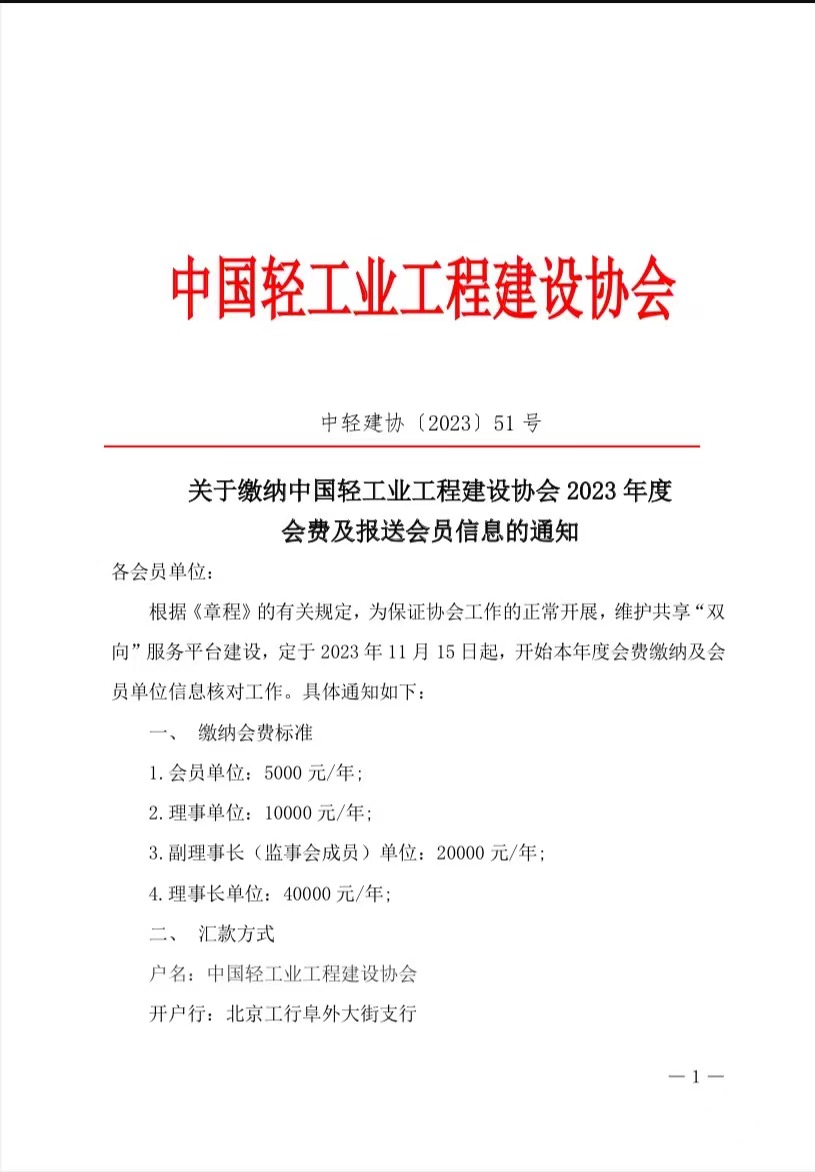 关于缴纳中国轻工业工程建设协会2023年度 会费及报送会员信息的通知