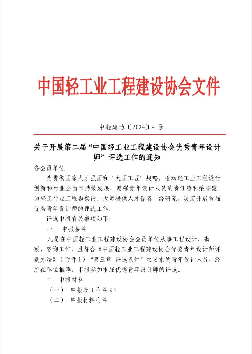 关于开展第二届“中国轻工业工程建设协会优秀青年设计师”评选工作的通知