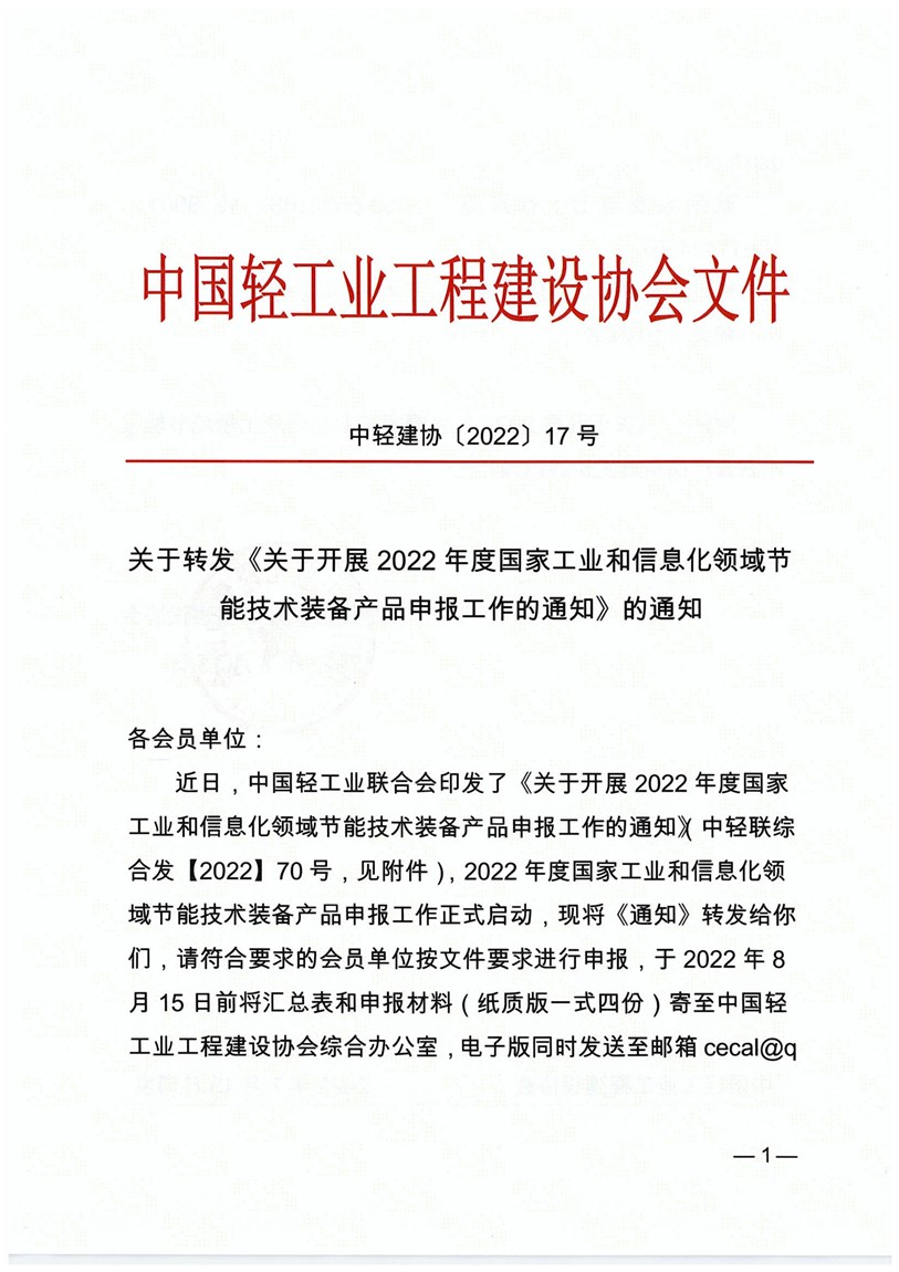 关于转发《关于开展2022年度国家工业和信息化领域节能技术装备产品申报工作的通知》的通知