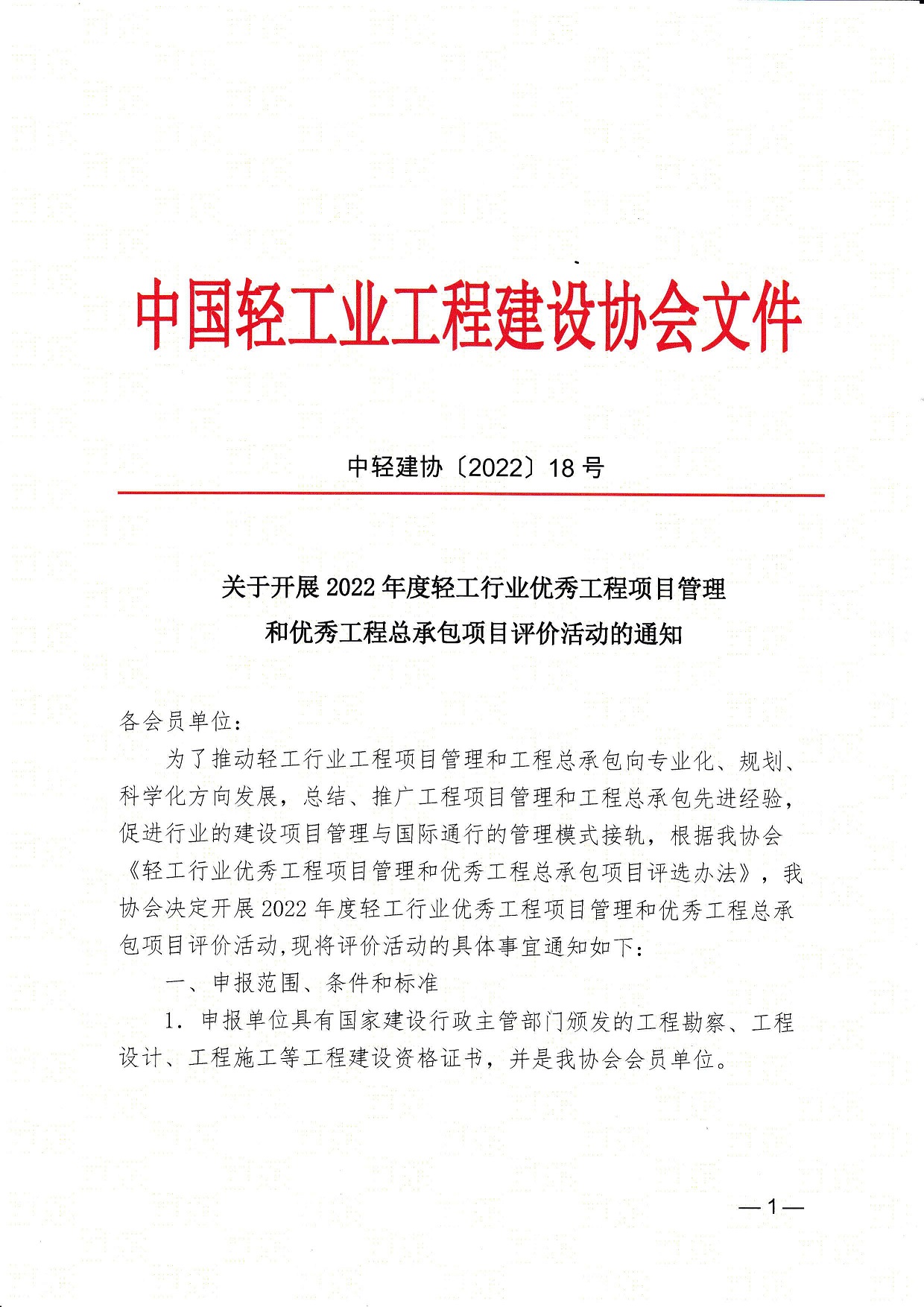关于开展2022年度轻工行业优秀工程项目管理和优秀工程总承包项目评价活动的通知