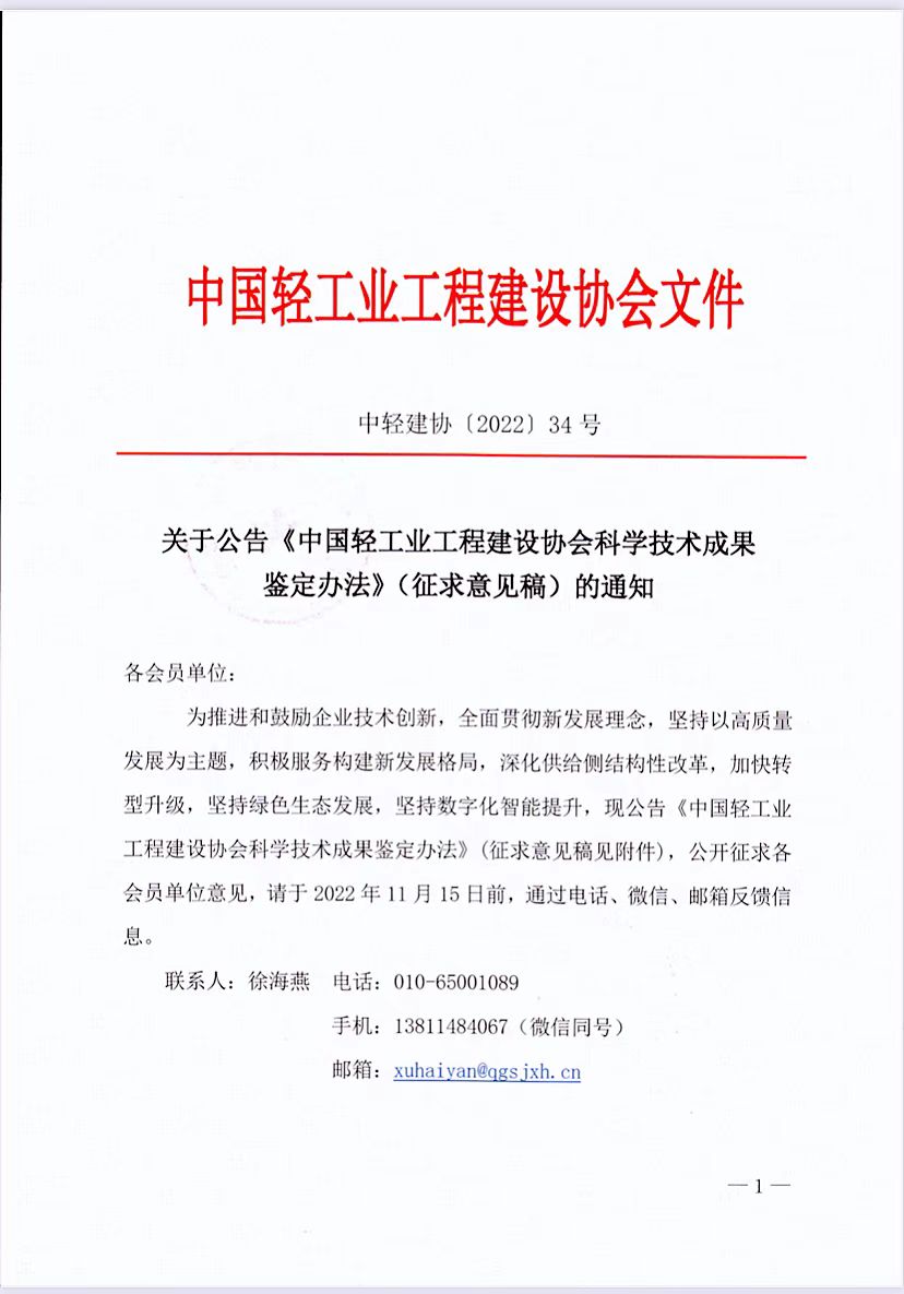 关于公告《中国轻工业工程建设协会科学技术成果 鉴定办法》(征求意见稿)的通知