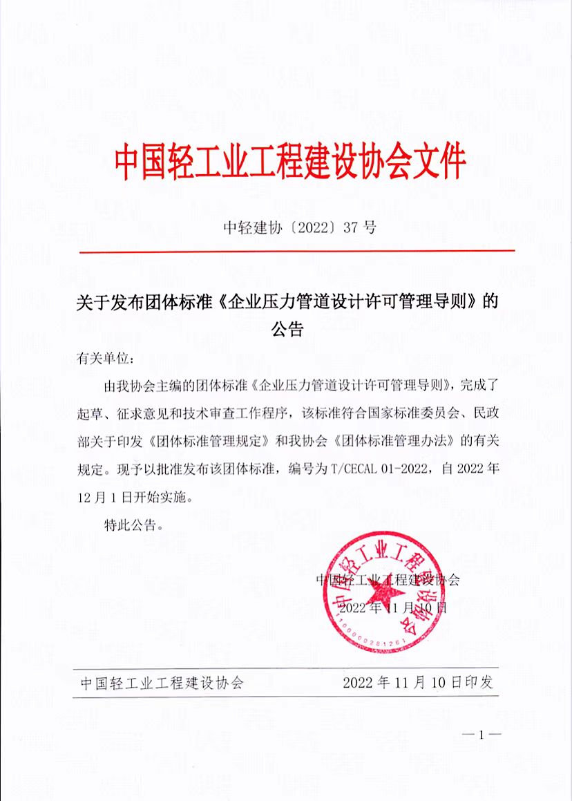 关于发布团体标准《企业压力管道设计许可管理导则》 的公告