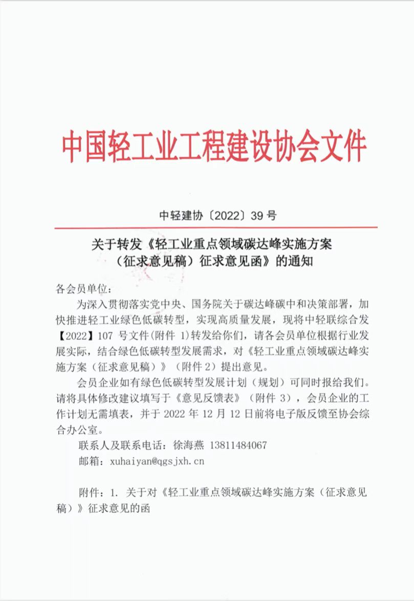 关于转发《轻工业重点领域碳达峰实施方案 (征求意见稿)征求意见函》的通知