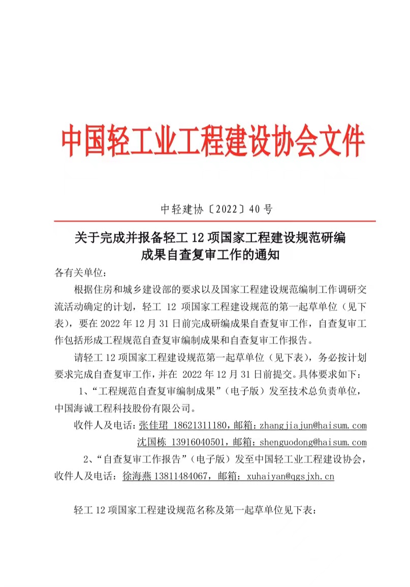 关于完成并报备轻工12项国家工程建设规范研编 成果自查复审工作的通知