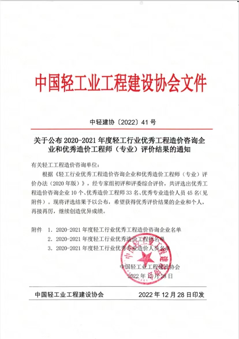 关于公布2020-2021年度轻工行业优秀工程造价咨询企业和优秀造价工程师(专业)评价结果的通知