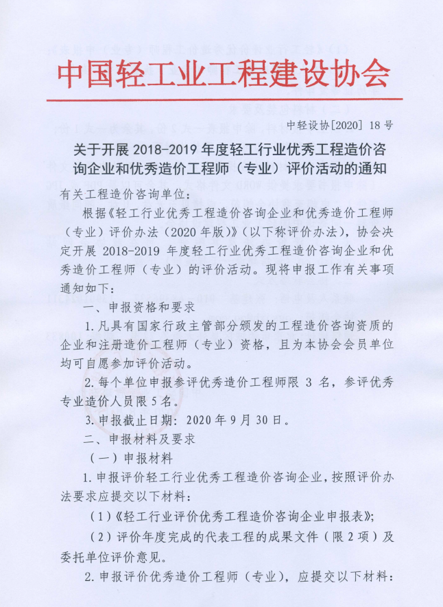 关于开展2018-2019年度轻工行业优秀工程造价咨询企业和优秀造价工程师(专业)评价活动的通知