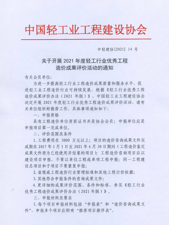关于开展2021年度轻工行业优秀工程造价成果评价活动的通知