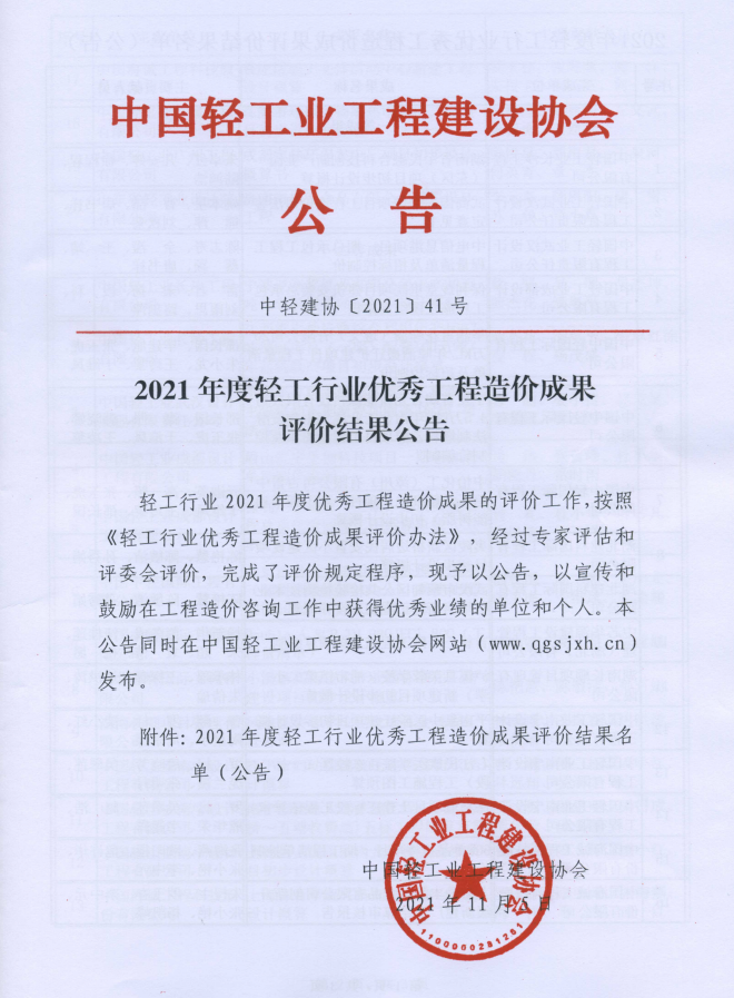 2021年度轻工行业优秀工程造价成果评价结果公告