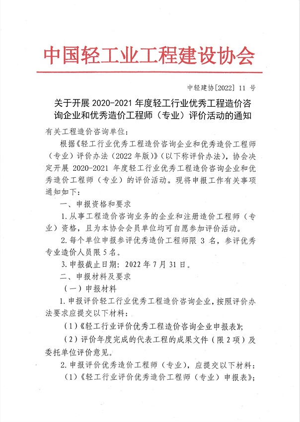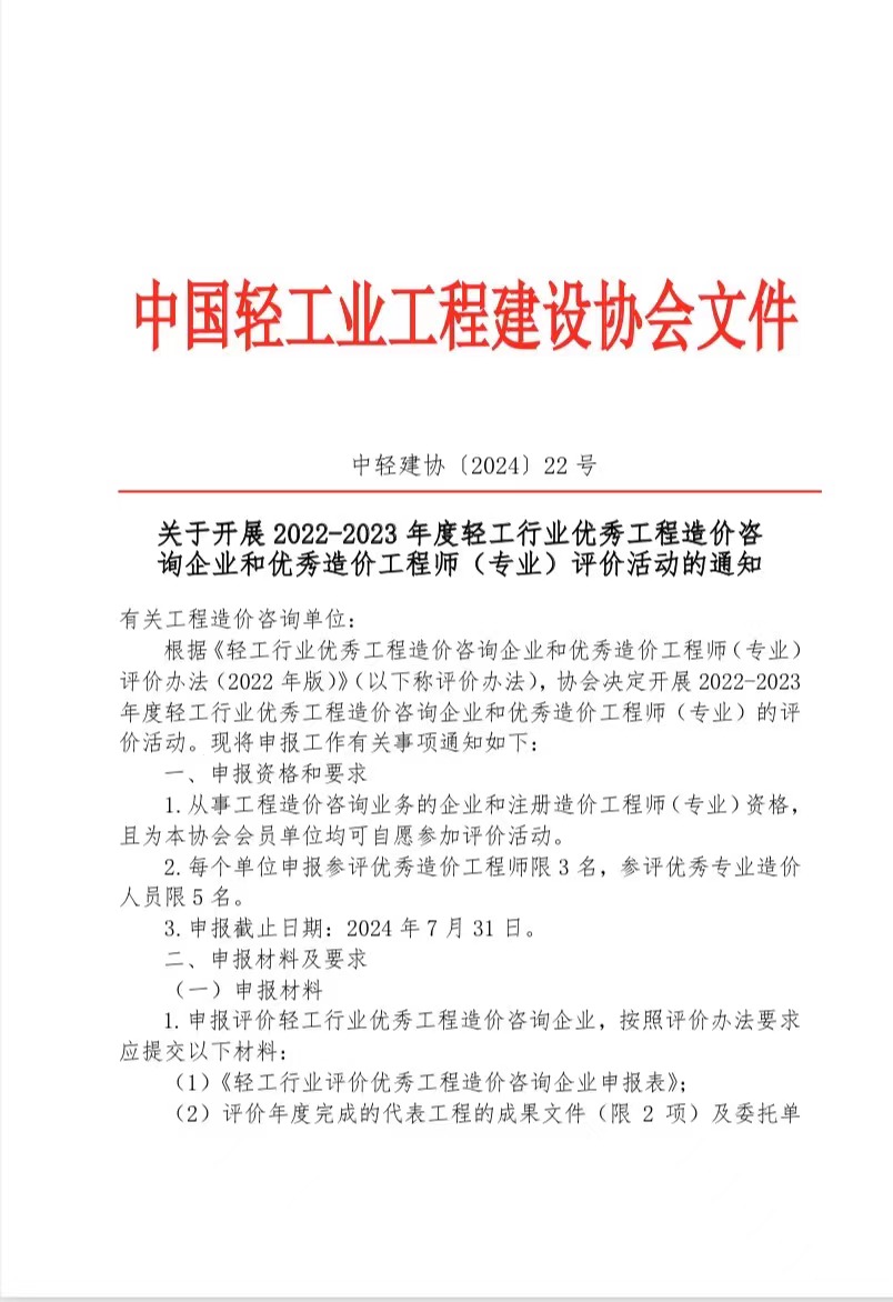 关于开展2022-2023年度轻工行业优秀工程造价咨 询企业和优秀造价工程师(专业)评价活动的通知