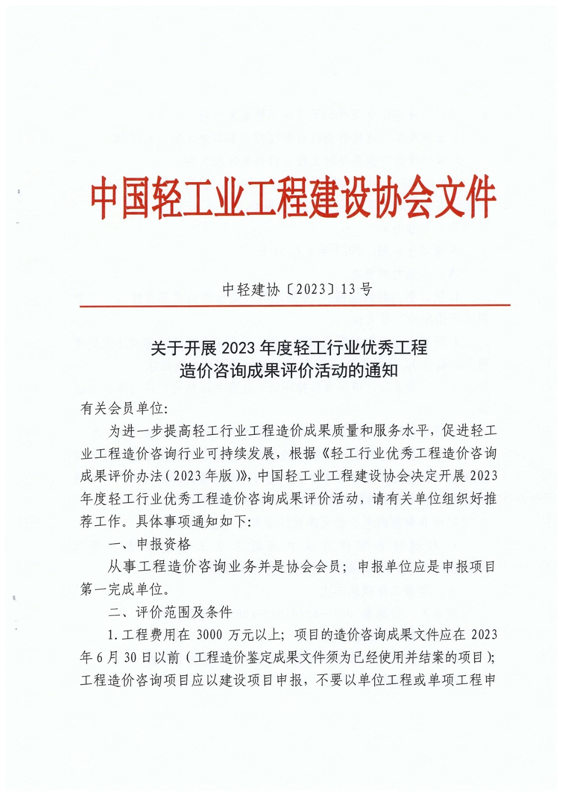 关于开展2023年度轻工行业优秀工程造价咨询成果评价活动的通知