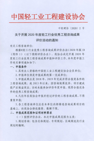 关于开展2020年度轻工行业优秀工程咨询成果评价活动的通知