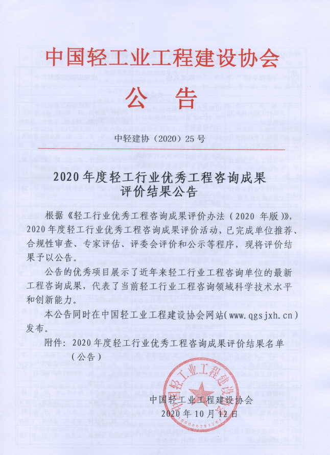 2020年度轻工行业优秀工程咨询成果评价结果公告