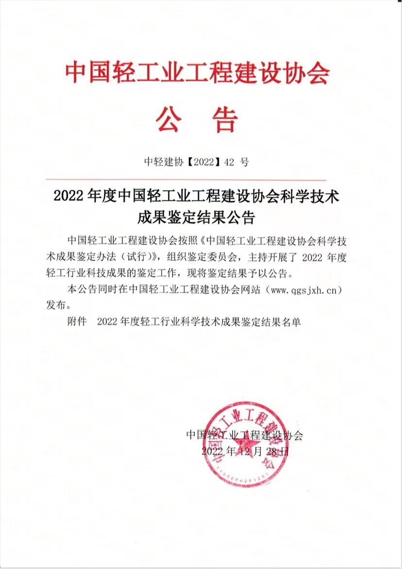 2022年度中国轻工业工程建设协会科学技术 成果鉴定结果公告