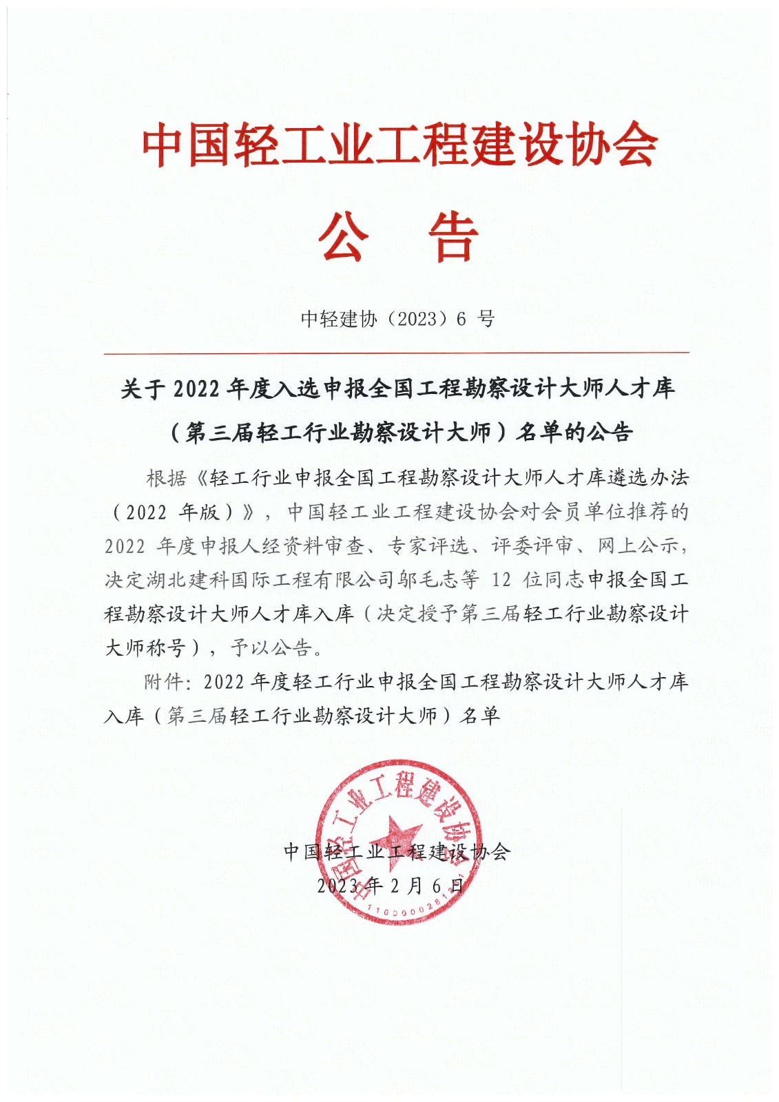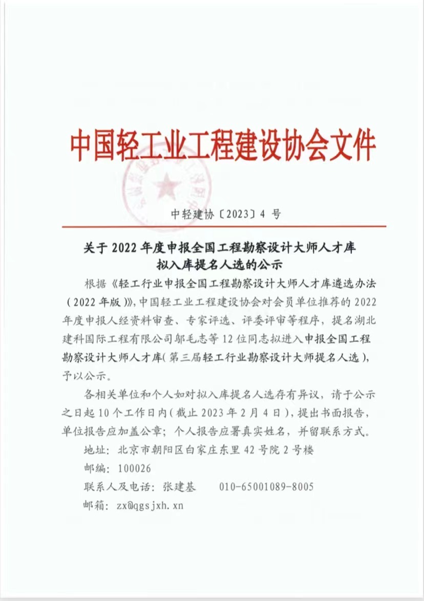 关于2022年度入选申报全国工程勘察设计大师人才库(第三届轻工行业勘察设计大师)名单的公告)