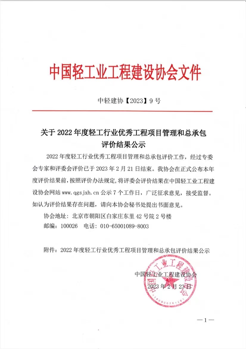 2022年度轻工行业优秀项目管理和工程总承包评价结果公告