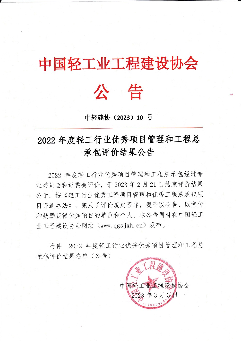 关于2022年度轻工行业优秀工程项目管理和总承包评价结果公示