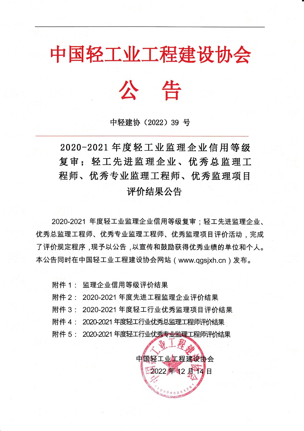 2020-2021年度轻工业监理企业信用等级复审;轻工先进监理企业、优秀总监理工程师、优秀专业监理工程师、优秀监理项目评价结果公告